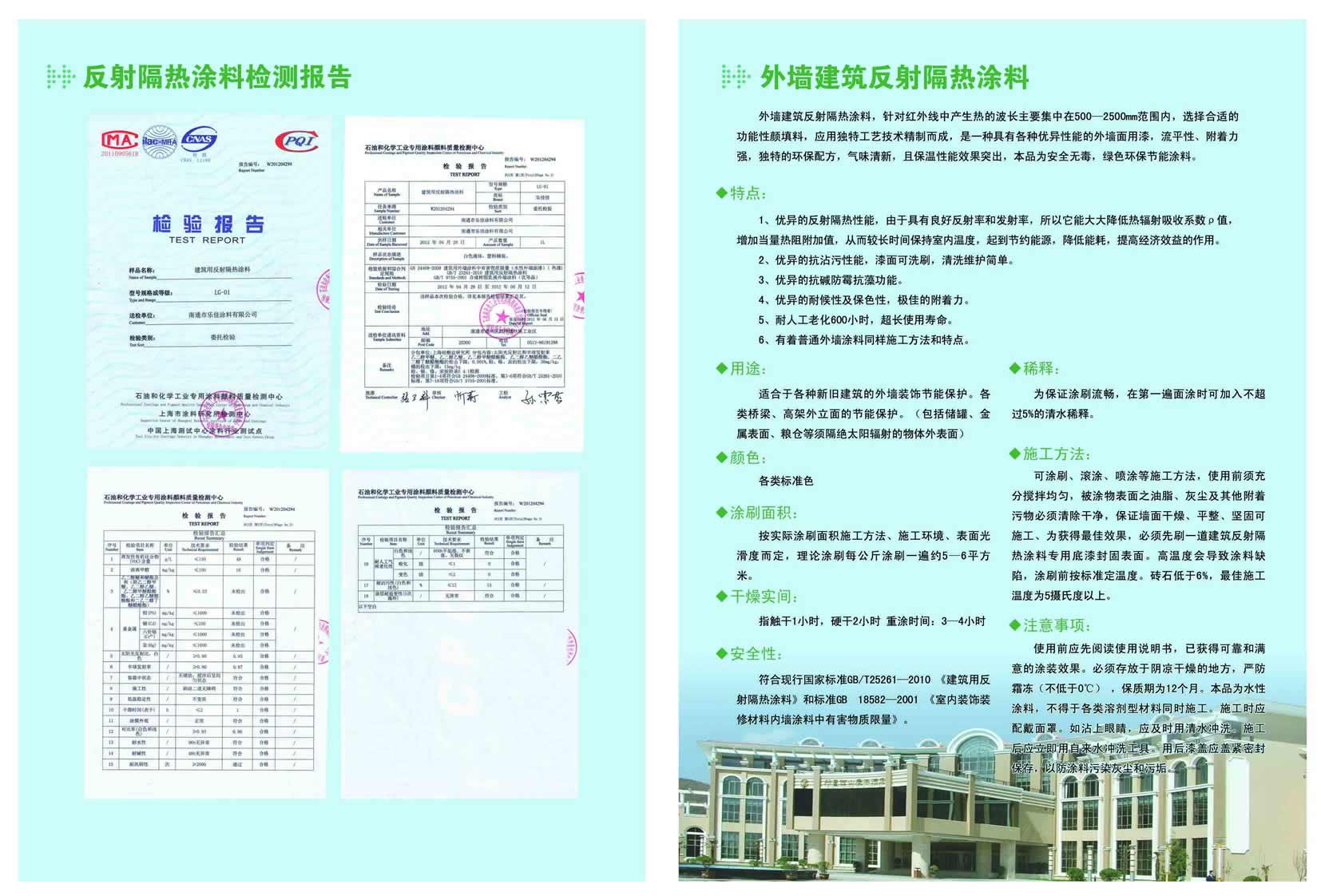 符合現(xiàn)行國家標(biāo)準(zhǔn)GB/T25261-2010《建筑用反射隔熱涂料》和標(biāo)準(zhǔn)GB 18582-2001 《室內(nèi)裝飾裝修材料內(nèi)墻涂料中有害物質(zhì)限量》。
